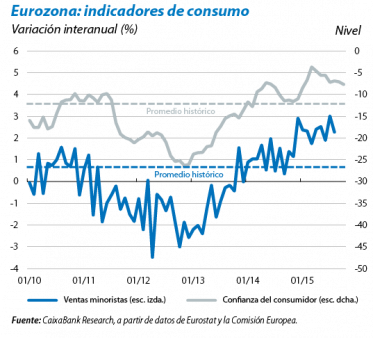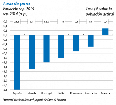 La gradual recuperación del mercado laboral respalda el consumo. En septiembre, la tasa de paro de la eurozona se situó en el 10,8%, 7 décimas por debajo de su nivel de hace un año. Los países periféricos, sobre todo España, han contribuido de forma importante a este descenso. De cara al 4T, los datos de expectativas de creación de empleo de la Comisión Europea apuntan a que la mejora del mercado laboral continuará. En concreto, por lo que respecta a la industria, si bien el dato de octubre sugiere una ligera ralentización (–3,0 puntos frente a los –2,8 puntos del 3T), sigue en cotas elevadas, compatibles con aumentos de empleo. El mismo patrón se observa en el sector de servicios. Destaca el caso alemán, que sigue reportando excelentes cifras en el ámbito del mercado laboral, con una tasa de paro, del 4,5%, en mínimos. Este entorno de bonanza en el mercado laboral ha contribuido al fuerte apoyo que Alemania está ofreciendo a los refugiados, ya que el Gobierno intuye que a medio plazo podrían ser un activo útil para suplir la escasez de la oferta laboral.