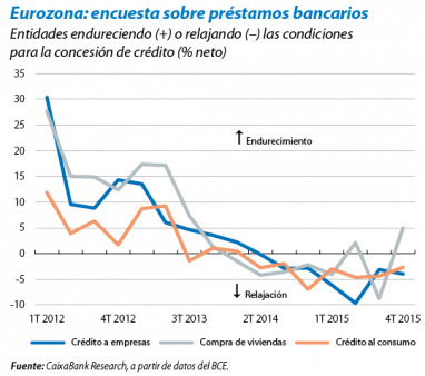 El aumento del crédito sugiere que los estímulos monetarios están siendo eficaces. Según la encuesta de préstamos bancarios de octubre, en el 3T 2015 los bancos relajaron los criterios de la concesión de crédito a las empresas y al consumo de los hogares, segmentos en los que se observa una fuerte demanda, favorecida por unos bajos tipos de interés. En cambio, los bancos endurecieron ligeramente los criterios para el crédito hipotecario, principalmente por razones regulatorias, a pesar de una demanda que crece con fuerza en algunos países, como los Países Bajos. De esta forma, la encuesta muestra que los bancos están utilizando la liquidez inyectada por el BCE para conceder más crédito.