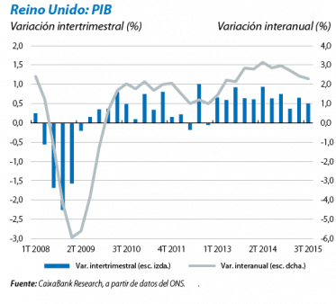 El ritmo de crecimiento del Reino Unido se desacelera, pero sigue siendo robusto. El PIB británico aumentó un 0,5% intertrimestral en el 3T 2015 (0,7% en el 2T). De esta forma, continúa la senda de ligera desaceleración iniciada a finales de 2014: la tasa de variación interanual se situó en el 2,3% en el 3T (frente al 2,9% del 3T 2014). Este menor avance de la actividad probablemente se deba a una estabilización de la demanda interna (de momento, se desconoce la composición del PIB del 3T), que estaba siendo el motor principal del crecimiento desde el inicio de la recuperación, pero que, en los últimos meses, ya había mostrado señales de ralentización. Esta moderación del avance del PIB, la tasa de inflación cercana a cero y las respuestas del resto de bancos centrales de los países desarrollados ante la desaceleración en los emergentes, podría justificar que el Banco de Inglaterra (BoE) retrasara la primera subida de tipos. Si el BoE se ve forzado a mantener el tono acomodaticio actual, la atención deberá centrarse en si es posible frenar, en este contexto, las presiones sobre los precios de los activos de riesgo, especialmente los inmobiliarios.