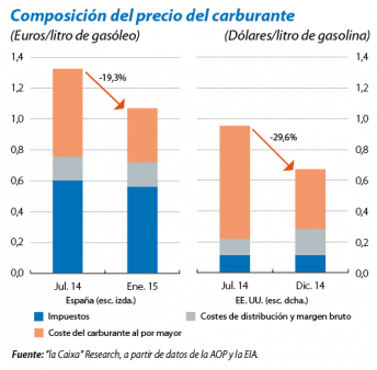 Otros elementos importantes del precio de venta del litro de gasóleo son el margen bruto del mayorista y los costes de distribución. Estos últimos incluyen los costes de personal y mantenimiento de las estaciones de servicios, los costes de transporte del carburante y una aportación al Fondo Nacional de Eficiencia Energética.1 Este componente representaba un 15% del precio final del gasóleo en enero de 2015 (frente a un 12% en julio de 2014) y, al menos a corto plazo, es fijo. Sumando las dos partes descritas hasta el momento, se obtiene el precio del gasóleo antes de impuestos, que ha caído un 30% desde julio.