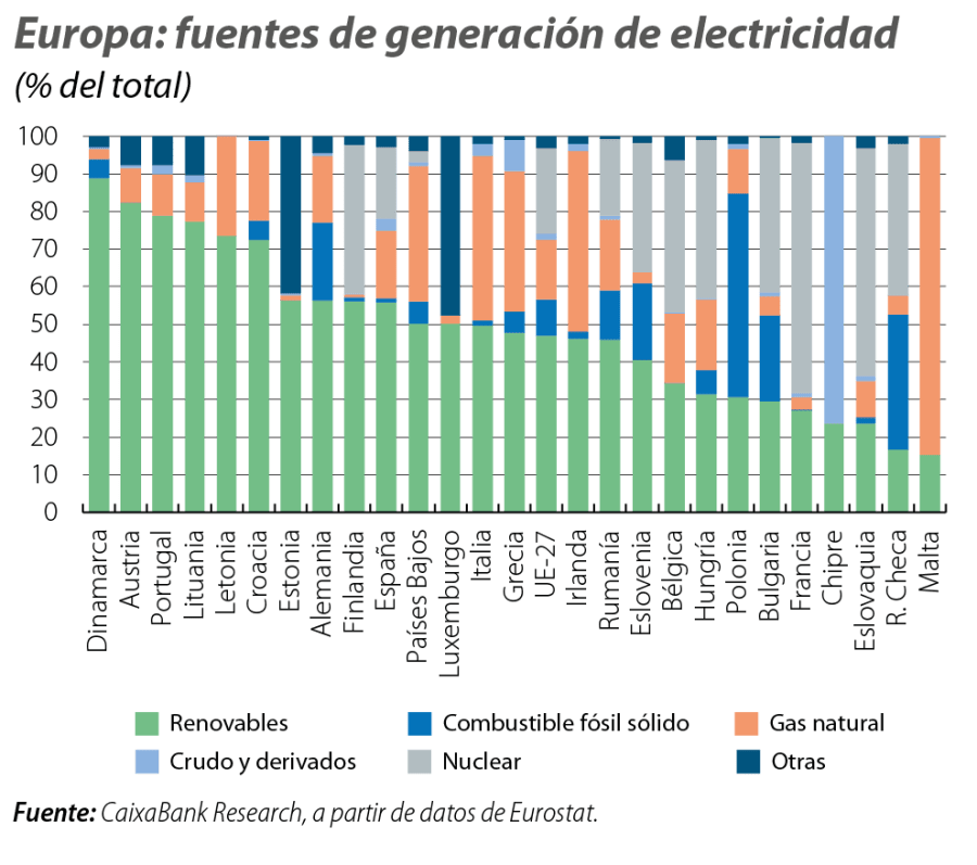 La electricidad no es una fuente primaria de energía, pero su precio dependerá del coste de los inputs usados en su generación. En Europa, los precios de la electricidad se fijan a través de un sistema marginalista que hace que su precio final venga determinado por la energía más cara necesaria para cubrir la demanda que, a menudo, suele ser la generada con gas, pese a no ser la principal fuente de generación.4 En el conjunto de la UE, más del 47% de la electricidad se genera con renovables, frente a menos del 16% con gas, o el 10% con carbón y el 23% con energía nuclear. Sin embargo, el agregado oculta importantes divergencias por países, lo que resulta determinante a la hora de valorar el impacto de una subida de los precios de los combustibles fósiles, sobre todo en aquellas economías con un peso importante de industria intensiva en energía.5