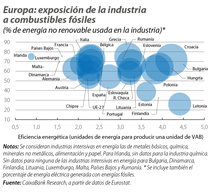 También es destacable Alemania: su sector industrial, uno de los mayores de la eurozona (casi un 21% del PIB) consume, directamente, más del 37% de todo el gas que gasta el país y cerca del 47% de toda la electricidad, que además se genera en un 18% con gas y en un 21% con carbón. Francia, en cambio, muestra una menor sensibilidad gracias a un parque nuclear que cubre la mayor parte de su demanda eléctrica (cerca del 67%) y a una economía menos dependiente del sector industrial (apenas representa un 12% del PIB). España e Italia, donde la industria pesa un 14% y un 18% del PIB, respectivamente, muestran diferente posición de partida. La industria en España representa cerca del 60% del consumo nacional de gas natural y casi el 30% del de electricidad, si bien ha reducido la generación de electricidad con carbón a menos del 1% y combina un 56% de renovables con un 19% de nuclear, lo que le da cierto colchón. Italia, sin embargo, es más vulnerable dado que su industria representa más del 30% de todo el consumo nacional de gas natural y electricidad, pero el 44% de la electricidad se genera con gas y el peso de las renovables en su producción es el menor de entre las cuatro grandes economías de la eurozona.