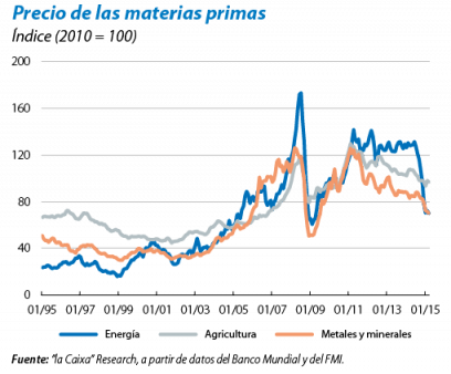 La evolución de los precios de las materias primas ha sido objeto de debate en los últimos meses, en buena parte a causa de la brusca caída de la cotización del petróleo, pero también por la tendencia a la baja de los precios de otras muchas materias primas. Después de 10 años de subidas significativas (con algún altibajo producido por la crisis), los precios de las materias primas, por lo general, se han alejado de sus picos (véase el primer gráfico). En este entorno de bajadas, la teoría que apunta al fin del llamado «superciclo» de las materias primas cobra fuerza.