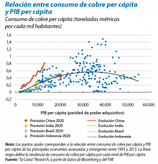 Si el actual cambio de patrón del crecimiento chino repercutiera en un consumo de cobre más acorde con su desarrollo, la demanda del metal podría disminuir de manera significativa, lo que, a su vez, empujaría su precio a la baja. Pero también es cierto que Brasil, Indonesia y la India podrían aumentarlo, lo que compensaría la corrección china. Es de esperar que estos tres países incrementen su consumo de cobre, no solo por la mejora en la renta per cápita prevista a medio plazo, sino sobre todo por la necesidad que tienen de superar los cuellos de botella en infraestructuras. Precisamente, el FMI señala que dichos cuellos de botella son un problema acuciante en Brasil y en la India (la segunda potencia demográfica del mundo, que ya roza los 1.300 millones de China). Así pues, según nuestras estimaciones, Brasil, Indonesia y, especialmente, la India podrían compensar en torno al 70% de la disminución de la demanda china de cobre.