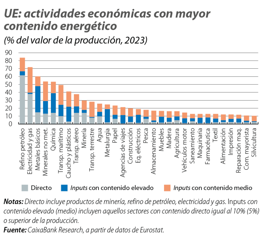 Asia es el principal destino de las exportaciones de petróleo y gas de Oriente Próximo, mientras que en Europa la dependencia directa es más moderada, aun siendo relevante para algunos países. Con todo, la naturaleza global de los mercados de materias primas hace que el shock se haya transmitido también a geografías con fuentes de aprovisionamiento alejadas del conflicto, e incluso bien abastecidas, como Norteamérica. De esta forma, empresas intensivas en petróleo y gas de todo el mundo han quedado expuestas a un encarecimiento de sus costes de producción. Los sectores con mayor exposición directa son el refino y la generación eléctrica, la industria química y metalúrgica, los servicios de transporte, los materiales de construcción y la agricultura (véase el primer gráfico, con datos agregados para la UE). A este impacto habría que sumar una segunda capa, a través de los productos derivados: algunos, como los fertilizantes al inicio de la cadena de valor alimentaria, tienen un alcance más específico; otros actúan como bienes intermedios clave para distintas ramas manufactureras, como los plásticos y los metales en la industria automotriz, y otros presentan un impacto más generalizado, como la electricidad, un input crítico para la mayor parte de la actividad económica y especialmente relevante para los centros de datos vinculados al despliegue de la IA.2