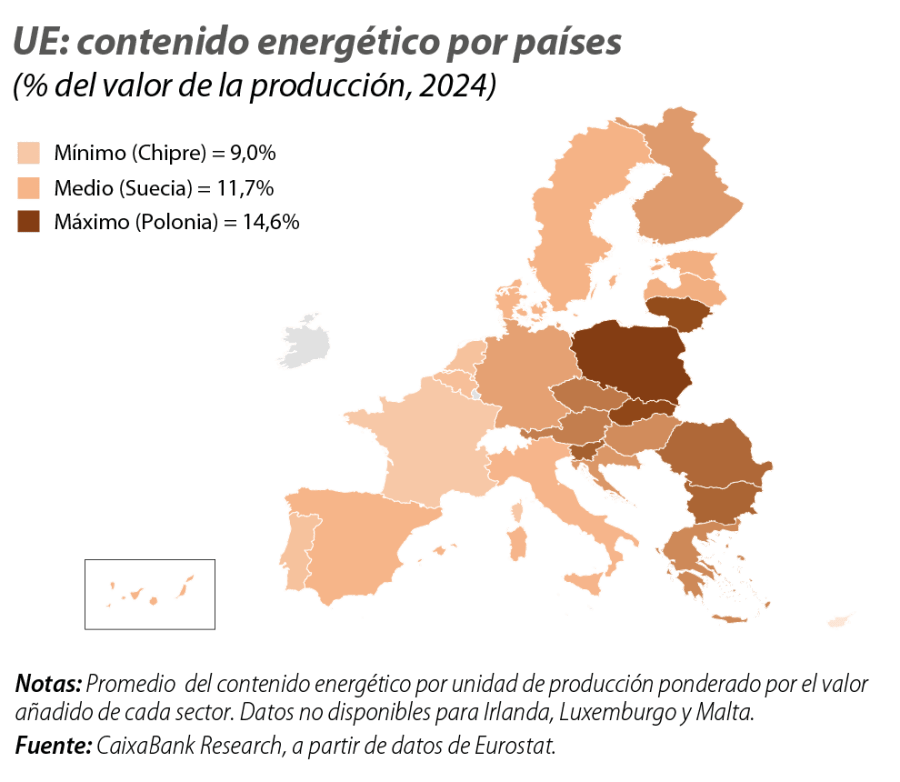 En los últimos años, la UE ha reducido su intensidad energética3 y, tras la invasión rusa de Ucrania, ha hecho grandes esfuerzos de diversificación.4 Sin embargo, todavía mantiene un elevado grado de dependencia externa en sus fuentes primarias de energía. Además, el peso de las renovables en la generación de electricidad convive con un sistema marginalista en el que siguen siendo los combustibles fósiles, en general, y el gas, en particular, los que a menudo determinan el precio.5 Todo ello hace que la sensibilidad europea a los mercados energéticos internacionales continúe siendo elevada. Las diferencias entre países responden, en gran medida, a la estructura productiva y al peso de los sectores intensivos en energía antes mencionados: el este de Europa es la zona relativamente más expuesta, con Polonia, Eslovaquia y Lituania a la cabeza (véase el segundo gráfico), y entre las economías de mayor tamaño, Alemania presenta el mayor porcentaje de contenido energético y Francia el más reducido.