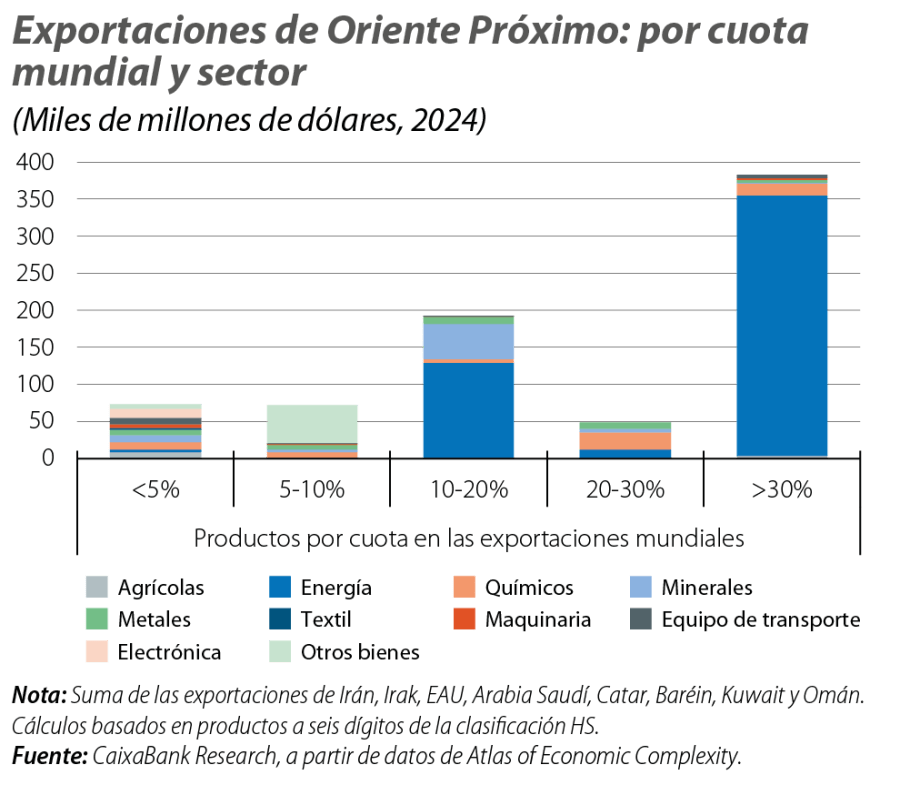 Por último, también conviene destacar el papel que desempeñan Dubái y Doha como hubs aéreos internacionales. Además de su función como conector intercontinental entre Europa, Asia y África, la región ha ganado un peso creciente como destino turístico y de negocios mediante el impulso de grandes eventos internacionales, congresos sectoriales y un notable desarrollo de infraestructuras hoteleras y de ocio. En 2024, el aeropuerto de Dubái –el segundo más transitado del mundo y el primero en tráfico internacional– alcanzó los 92 millones de pasajeros y el de Doha se acercó a los 53 millones. El agravamiento y la prolongación de la guerra en Irán podría desviar los flujos aéreos y de viajeros hacia otras zonas, y beneficiar potencialmente a Europa, tal y como ocurriera durante la Primavera Árabe en 2010 y, más recientemente, a raíz de los conflictos abiertos de Israel.
