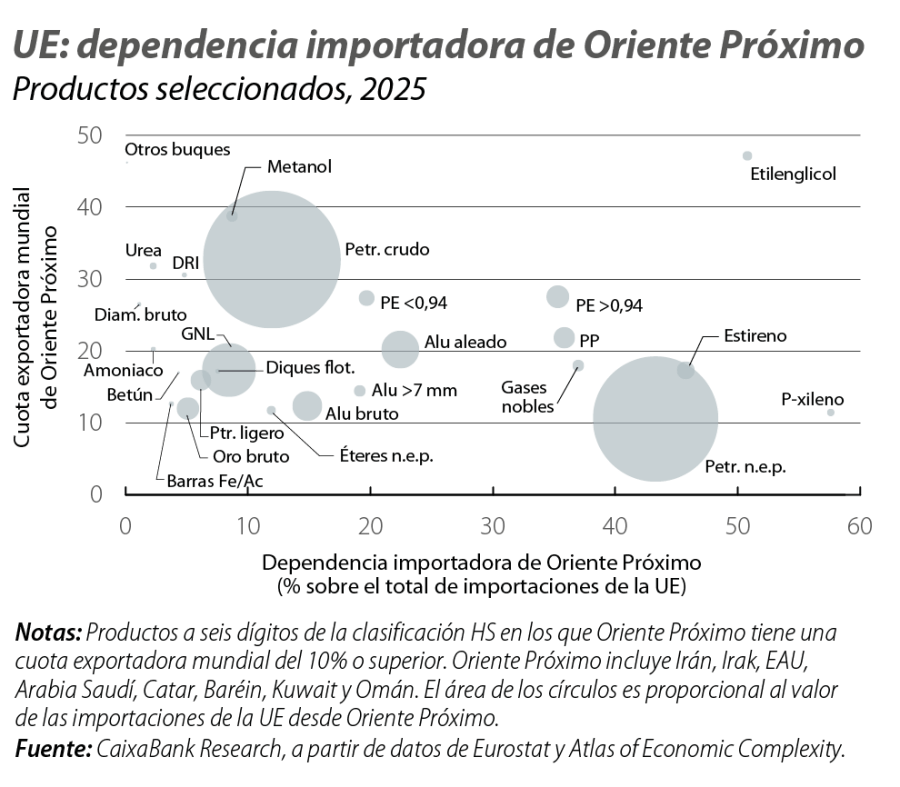 La relevancia económica de Oriente Próximo va mucho más allá de los mercados de petróleo y gas, cabeza más visible, a corto plazo, de los efectos de la guerra. Países como Arabia Saudí, Catar y EAU son importantes productores y exportadores de productos no energéticos, sobre todo en el sector químico y metalífero (véase el tercer gráfico). Entre ellos destacan nutrientes para la elaboración de fertilizantes, como la urea, cuya producción en el conjunto de la región suma cerca de un tercio de las exportaciones mundiales, y de las que India y Brasil son altamente dependientes. También la provisión de materias primas fundamentales para un amplio abanico de productos plásticos, como el etilenglicol, el polietileno (PE) o el polipropileno (PP), que representan más del 25% de la cuota mundial, siendo Asia el principal cliente. También el helio, un gas noble crítico para la industria de semiconductores, del que la región es un proveedor clave y con Taiwán entre los países más dependientes. Y el aluminio y sus aleaciones (cuota del 15%), destinados a la metalurgia, la automoción, la construcción o la maquinaria, del que Europa es uno de los mayores compradores (véase el mapa de principales dependencias importadoras de la UE en el cuarto gráfico).