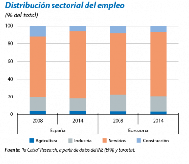 La construcción también ha despuntado por su buen comportamiento en los últimos meses. Tras perder más de 1,5 millones de afiliados a la Seguridad Social entre 2008 y 2014, desde el mes de octubre presenta una tasa de crecimiento interanual positiva. De hecho, esta se situó en el 5,6% en abril, claramente por encima del resto de sectores. El ajuste que sufrió la construcción redujo el peso de empleo de este sector sobre el total del 12,0% en 2008 al 5,7% en 2014 (véase el tercer gráfico). Esta última cifra es comparable con la de la eurozona (del 6,6%), por lo que cabe esperar que a partir de ahora vuelva a contribuir positivamente a la creación de empleo a ritmos compatibles con la moderada recuperación del mercado inmobiliario.