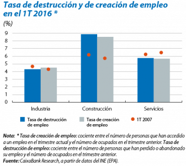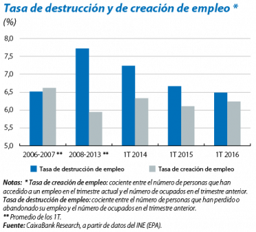 Pasando al análisis de los datos, en el 1T 2016, la tasa de destrucción de empleo fue del 6,5%, muy similar a la anterior a la crisis, ligeramente inferior a la del 1T 2015 y muy por debajo de la registrada, en promedio, durante la etapa recesiva. La tasa de creación de empleo ascendió un poco, hasta el 6,2%, pero siguió estando por debajo de la del 2007. Estos datos muestran que la mejora de la ocupación se explica sobre todo por la menor destrucción de empleo.