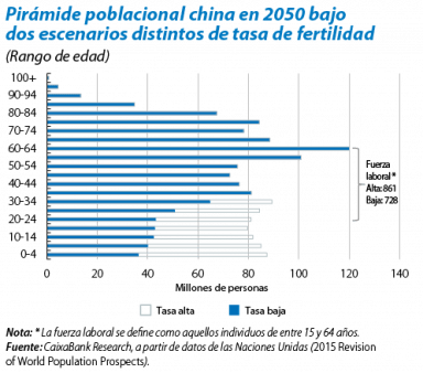 Para hacernos una idea del posible efecto de la supresión de la llamada política del hijo único, tomamos dos escenarios sobre la evolución de la población china realizados por las Naciones Unidas.2 En concreto, el escenario alto captura la probable evolución de la tasa de fertilidad causa de la supresión de la medida demográfica: supone un rápido aumento de la tasa de fertilidad, que se situaría ligeramente por encima de los dos hijos por mujer ya en 2020 y en los 2,25 en 2050. Por el contrario, el escenario bajo asume una tasa de fertilidad que sigue disminuyendo y se sitúa en el 1,25 en 2050, lo que se acomodaría a una situación de continuidad de la restricción del hijo único. A pesar de la gran diferencia entre un escenario y otro, la fuerza laboral cae en ambos durante el periodo 2015-2050, puesto que la mayor parte de los trabajadores de esos años (más del 85%) serán individuos nacidos antes de 2015 y en ellos se refleja la prolongada reducción de la tasa de fertilidad hasta la fecha. Los «bebés de más» que nacerán como consecuencia del fin de la política del hijo único no se incorporarán al mercado de trabajo hasta bien entrada la década de 2030.