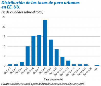 La Gran Recesión sacudió duramente los mercados laborales nacionales: las mínimas tasas de paro de 2007 (8,2% en España, 4,6% en EE. UU.) se habían duplicado ampliamente en 2010 (19,9% en España, 9,6% en EE. UU.).1 La violencia de tales movimientos genera una necesidad natural de entender el ciclo económico. Sin embargo, existen contrastes de magnitud parecida entre los mercados laborales de las ciudades, en un punto cualquiera del tiempo, como muestra el primer gráfico. En términos de paro, viajar en 2014 de Denver (Colorado), con un paro del 4,5%, a Atlantic City (Nueva Jersey), con una tasa del 11,2%, se parece a viajar en el tiempo, de la mejor época de bonanza en 2007 al pico de la recesión en 2010.2 Además, estas diferencias son persistentes y van más allá de las diferencias demográficas (edad, formación, raza, etc.) entre los residentes de cada ciudad.3 Ello muestra que el mercado laboral tiene un fuerte componente local y nos sirve para ejemplificar las economías y deseconomías de aglomeración.