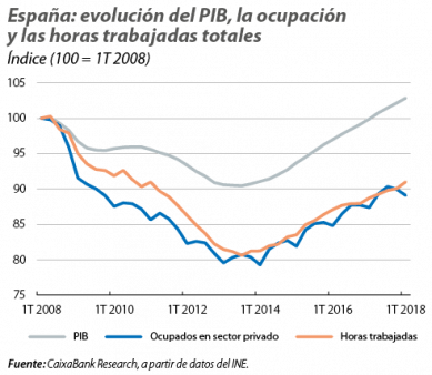 Sin embargo, la industria y la construcción también contribuyen a la mayor intensidad en la creación de empleo. En concreto, la fuerte destrucción de empleo que se produjo en ambos sectores a lo largo de la recesión (por ejemplo, entre 2008 y 2013, desaparecieron dos de cada tres puestos de trabajo en la construcción y casi uno de cada tres en la industria) hace que hoy exhiban fuertes tasas de crecimiento para recuperar parte del empleo perdido. Así, en el 1T 2018 se observó un crecimiento de la ocupación del 2,9% en el sector industrial y del 7,2% en el sector de la construcción, mientras que entre los años 2000 y 2008 este crecimiento fue nulo en el primero y del 6,5% en el segundo.
