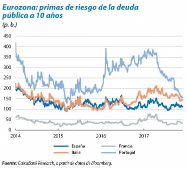 Las bolsas europeas se quedan atrás mientras la bolsa estadounidense acumula récords. Pese a un inicio tímido de mes, la bolsa estadounidense terminó noviembre con nuevos máximos históricos, alentada por una mayor concreción de la reforma fiscal. En Europa, las bolsas tuvieron más dificultades en recuperar la corrección sufrida al inicio del mes y acabaron registrando caídas significativas que deshicieron las fuertes subidas registradas después de que el BCE anunciara, a finales de octubre, que extendería el QE hasta septiembre de 2018. Las caídas fueron generalizadas en el conjunto de los países de la región (Eurostoxx50: –2,8%, DAX: –1,6%, CAC: –2,4% y PSI: –0,9%), si bien el Ibex registró uno de los descensos más importantes (–3,0%), principalmente a causa de la persistencia de la incertidumbre política. Con todo, los mercados europeos de renta variable mostraron señales de estabilización en los últimos días del mes, aunque no llegaron a recuperar una senda alcista clara.