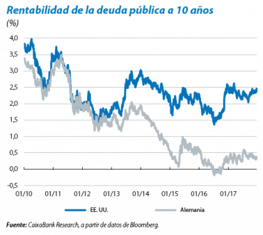 La Fed cierra 2017 con la tercera subida de tipos del año. Como se esperaba, en la reunión de diciembre, el Comité Federal del Mercado Abierto (FOMC, por sus siglas en inglés) aumentó el tipo de interés objetivo en 25 p. b. hasta el intervalo 1,25%-1,50%. Contrastando con el clima dubitativo de 2016, cuando solo se había realizado una de las tres subidas previstas, durante 2017 la Fed incrementó el tipo de referencia en tres ocasiones (marzo, junio y diciembre) y cumplió, así, con los pronósticos fijados en diciembre de 2016. Además, la actualización trimestral del cuadro macroeconómico de la Fed reflejó la perspectiva de que la economía estadounidense seguirá creciendo por encima de su potencial en los próximos años, en unas previsiones que, según indicó la presidenta Janet Yellen, incorporan el impacto de la reforma impositiva de la Administración Trump. Por ello, los miembros del FOMC reafirmaron la voluntad de seguir con el endurecimiento gradual de la política monetaria y reiteraron una proyección de tres subidas de tipos en 2018, y dos más en 2019, una expectativa acorde con el escenario de CaixaBank Research. Tras estos anuncios, los mercados reaccionaron sin movimientos de calado, aunque cabe destacar que, desde septiembre, el número de subidas de tipos esperado por el mercado de cara a 2018 se ha movido paulatinamente al alza, pasando de una a dos.