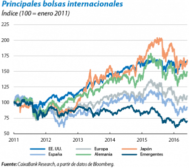 Las bolsas emergentes sufren pérdidas importantes, mientras que la bolsa europea logra terminar el mes en positivo gracias a un fuerte repunte de último momento. En mayo, los mercados emergentes de renta variable registraron descensos cercanos al 4% en promedio. Esta recaída responde a dos tipos de factores. Primero, los factores globales, en especial el endurecimiento del mensaje de la Fed. Segundo, los factores internos, que siguen dominados por los riesgos geopolíticos. Brasil, con el aumento de la incertidumbre política a raíz de los avances en el proceso de destitución presidencial, sigue siendo el caso más preocupante. En el bloque avanzado, después de un inicio de mes débil, la bolsa europea ganó un 1,2%, apoyada en los avances positivos en la cuestión griega. Esta pauta optimista fue generalizada en el conjunto de los grandes sectores, aunque el bancario fue el más beneficiado. En EE. UU., el S&P 500 registró una subida de una magnitud similar, con un crecimiento del 1,5%.