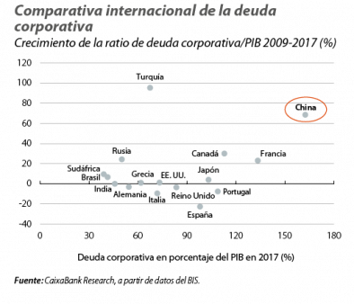 La elevada deuda corporativa china, emplazada en el 160% del PIB a finales de 2017 según el BIS, se ha convertido en una fuente de preocupación central para el Ejecutivo chino.1 Esta preocupación es más que fundada: desde finales de 2008, la deuda corporativa sobre el PIB ha aumentado en 64 p. p. y, si se hace una comparativa a nivel internacional, se observa que China es la única economía de peso donde tanto el nivel como el crecimiento de la deuda se sitúan en cotas tan elevadas (en EE. UU. y en la eurozona la deuda corporativa se emplaza en el 73,5% y en el 101,6% del PIB, respectivamente). Para poner estos números en contexto, sirva de referencia que normalmente ratios superiores al 90% suponen un lastre importante para la economía. Además, teniendo en cuenta el peso sistémico de la economía china, las dudas sobre la sostenibilidad de dicha deuda podrían tener un impacto sobre la estabilidad macroeconómica y financiera a nivel global.