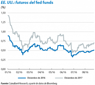 Por su parte, la Reserva Federal (Fed) adopta un registro conservador y recalca que aplicará una senda de normalización muy gradual. La reunión de finales de julio del banco central estadounidense no deparó grandes novedades. A pesar del tono conservador del comunicado oficial, la Fed constató el descenso de los riesgos derivados del brexit y resaltó la fortaleza del mercado laboral. Esto sugiere que la Fed mantiene la puerta abierta a subir el tipo oficial antes de que finalice este año, en línea con nuestro escenario, que fecha la segunda subida del fed funds en diciembre. En este mismo sentido se pronunció Yellen en el simposio anual de política monetaria de Jackson Hole (EE. UU.), donde resaltó que las condiciones para efectuar una nueva subida de tipos (evolución del empleo e inflación) se han reforzado en los últimos meses.