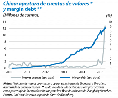 La primera cuestión que se debe examinar es si existen indicios que hagan presagiar la gestación de una fase de burbuja. Desafortunadamente, las evidencias parecen apuntar en sentido afirmativo. De entrada, el imponente avance de las bolsas de la China continental se ha visto reforzado por un aumento vertiginoso de las compras apalancadas de los inversores (margin debt), hasta alcanzar un máximo histórico de 300.000 millones de dólares. Otro indicador inquietante es el ritmo de apertura de cuentas de valores para negociar acciones cotizadas en las bolsas de Shanghái y Shenzhen. En abril, se llegaron a abrir cuatro millones de cuentas a la semana, frente al promedio semanal de 150.000 de los últimos cinco años. La tipología de estas cuentas, cuya titularidad corresponde a pequeños inversores en un 80%-90%, denota que la inversión bursátil vuelve a estar de moda en el país. Un tercer motivo de preocupación procede de la naturaleza subyacente del propio rally bursátil: la liquidez domina, al menos por ahora, los beneficios. En efecto, las medidas de estímulo adoptadas por las autoridades monetarias desde mediados de 2014 han ejercido una influencia notable a la hora de impulsar las cotizaciones bursátiles. Paradójicamente, la publicación de registros de actividad y de sentimiento más débiles de lo previsto en el 1T 2015 ha fortalecido el régimen alcista de las bolsas, dado que ha alimentado expectativas de mayor laxitud monetaria. Por otro lado, las revisiones a la baja de las previsiones de beneficios empresariales del consenso de analistas para los años 2015 y 2016 no han frenado la escalada bursátil. En consecuencia, las métricas de valoración de la bolsa china han experimentado un deterioro considerable. En los últimos 12 meses, las ratios PER (precio sobre beneficios) de las bolsas de Shanghái y Shenzhen se han duplicado hasta 21 y 60, respectivamente.
