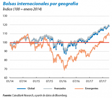 Las principales bolsas mantienen un ritmo constructivo, aunque permanecen sensibles a los riesgos geopolíticos, en particular en el bloque emergente. Los activos de renta variable mostraron un buen desempeño en las primeras semanas del mes. Las bolsas europeas y estadounidenses crecieron a un ritmo firme y alcanzaron nuevos máximos históricos en el caso de las últimas, lo que persiste como una fuente de preocupación que cada mes cobra más importancia. Al final del mes, los anuncios de los detalles de la tan esperada reforma fiscal de Donald Trump, que prevé, entre otras cosas, una reducción del tipo impositivo de las empresas desde el actual 35% hasta el 20%, sirvieron de catalizador para impulsar de nuevo la renta variable en el bloque desarrollado y, en particular, en EE. UU. En el bloque emergente, las bolsas se beneficiaron de la mejora del cuadro macroeconómico con subidas sostenidas durante la mayor parte del mes, pero la reaparición de tensiones con Corea del Norte volvió a generar correcciones notables. Además, esta vez, estos descensos también fueron ligeramente amplificados por las mayores expectativas de subida de tipos en EE. UU. Con todo, este repunte de nerviosismo en los mercados emergentes debería ser temporal.