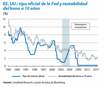 En 2005, el entonces presidente de la Reserva Federal (Fed), Alan Greenspan, tildó de enigmático el comportamiento de los tipos de interés de largo plazo durante el periodo de endurecimiento de política monetaria que estaba en curso. Las cifras fueron elocuentes: entre junio de 2004 y julio de 2006, la Fed incrementó el tipo rector en 4 p. p. para hacer más restrictivas las condiciones financieras y atajar el riesgo de sobrecalentamiento de la economía. Pero el tipo de la deuda soberana a 10 años apenas aumentó 0,3 puntos, de modo que uno de los principales canales de transmisión de la maniobra de frenada quedó neutralizado. La posible reaparición de este fenómeno, bautizado como «enigma de Greenspan» (Greenspan's conundrum), ha cobrado protagonismo ante el inminente inicio de la normalización de los tipos de interés oficiales en EE. UU.