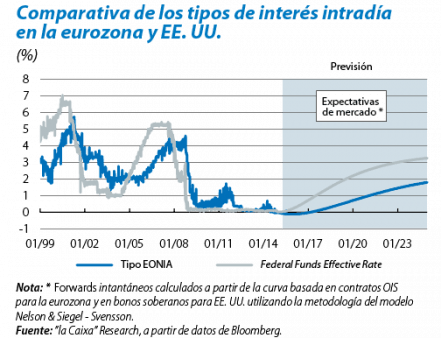 EE. UU., pero veloz respecto a lo que se espera para el BCE. Concretamente, el tipo rector de la Fed empezaría a subir a mediados de 2015 y superaría el 2% a mediados de 2017. De hecho, el diferencial entre los tipos de interés a ambos lados del Atlántico irá ampliándose hasta 2019, cuando superará los 230 puntos básicos (un nivel similar a los máximos registrados en episodios del pasado).