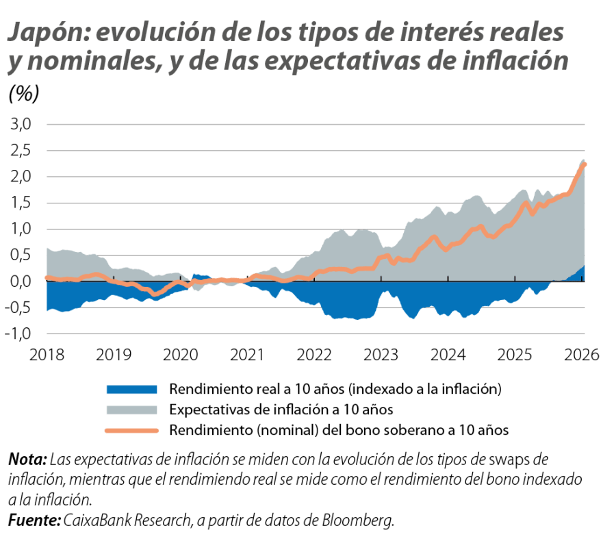 El repunte de los tipos de interés ha venido de la mano de una progresiva normalización de la política monetaria del Banco de Japón (BoJ, por sus siglas en inglés) y de su control sobre la curva de tipos de interés.1 Esta evolución se puede desagregar entre movimientos en los tipos reales y en las expectativas de inflación. La reciente subida de los tipos nominales en Japón responde, sobre todo, a un repunte sostenido de las expectativas de inflación de largo plazo (véase el primer gráfico). Desde 2022, han pasado de niveles próximos al 0% hasta un rango del 1,5%-2% recientemente, en paralelo a una inflación observada más persistente (cercana al 3%, un nivel no visto desde el inicio de la década de los noventa). Este movimiento refleja dinámicas de fondo más allá del shock inicial de materias primas, tras la eclosión del conflicto Rusia-Ucrania, como efectos de segunda ronda, subidas salariales tras años de estancamiento,2 además de factores idiosincráticos (como las subidas de precios de los alimentos y, en particular, del arroz) y un yen depreciado.
