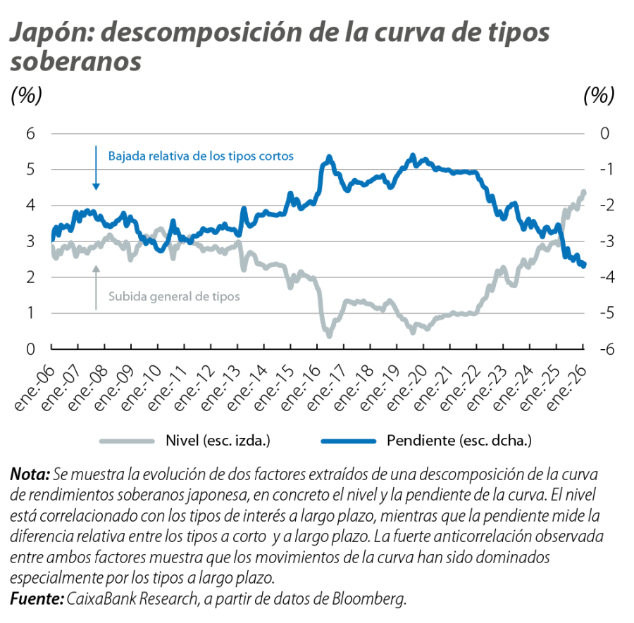 A estos factores se ha sumado, en los últimos meses, la llegada al poder de la primera ministra Sanae Takaichi6 y un giro expansionista, anclado en una retórica de una política fiscal «proactiva y responsable», que incluye aumentos de la inversión pública y recortes de impuestos, de entre los cuales cabe destacar la eliminación temporal del gravamen del 8% sobre alimentos, una promesa electoral clave, cuyo impacto se estima alrededor del 0,8% del PIB al año.