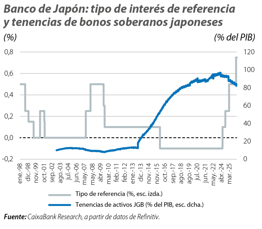 En este contexto, el BoJ se encuentra ante un giro estructural del entorno macroeconómico. Tras muchos años en los que se ha enfrentado a una situación de deflación, el país ha logrado situarse por encima del objetivo de inflación del 2% desde 2022, y las expectativas de largo plazo se encuentran ancladas alrededor de ese nivel. Así, el BoJ ha empezado a reajustar su política monetaria, con el abandono del YCC en 2024, subidas graduales de tipos de interés y una estrategia de quantitative tightening, que reduce el ritmo de compra de activos, sobre todo de bonos soberanos (aproximadamente la mitad de la deuda de Japón está en manos del BoJ).