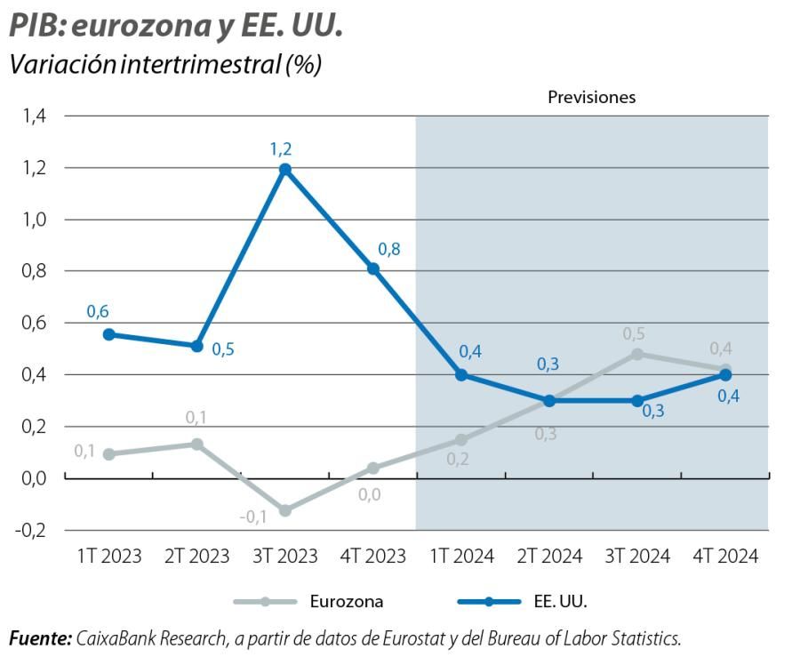 Respecto de la eurozona, las expectativas siguen apuntando a una marcada debilidad: a un final de 2023 en el que se evita, por la mínima, un episodio de «recesión» técnica, se añade un comienzo de año que sigue siendo débil (véase la coyuntura de Internacional). Esta apatía es más marcada en Alemania y Francia, donde sus respectivos gobiernos revisaron en febrero notablemente a la baja sus previsiones de crecimiento para 2024: hasta el 0,2%, desde el 1,3%, el alemán; y hasta el 1,0%, desde el 1,4%, el francés. Nuestro escenario siempre ha sido bastante cauto y venimos señalando las dificultades de la economía de la eurozona para recuperar ritmos de crecimiento cercanos a su potencial, con un inicio de 2024 de práctico estancamiento.