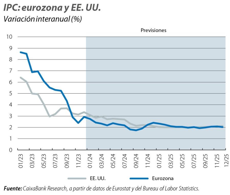 En este contexto de apatía económica, y después de una fuerte bajada de la inflación en 2023, tanto en la general (se situó en el 5,4%, tras un 8,4% en 2022) como en la núcleo (4,9% vs. 3,9% en 2022), seguimos esperando que la inflación descienda a lo largo de 2024. De hecho, los buenos datos de finales de 2023 y el descenso en los precios futuros de la energía que barajan los mercados nos llevan a rebajar la previsión en 2024 para la inflación general hasta el 2,2% (3,1% previo) y para la núcleo, hasta el 2,6% (3,0% previo).