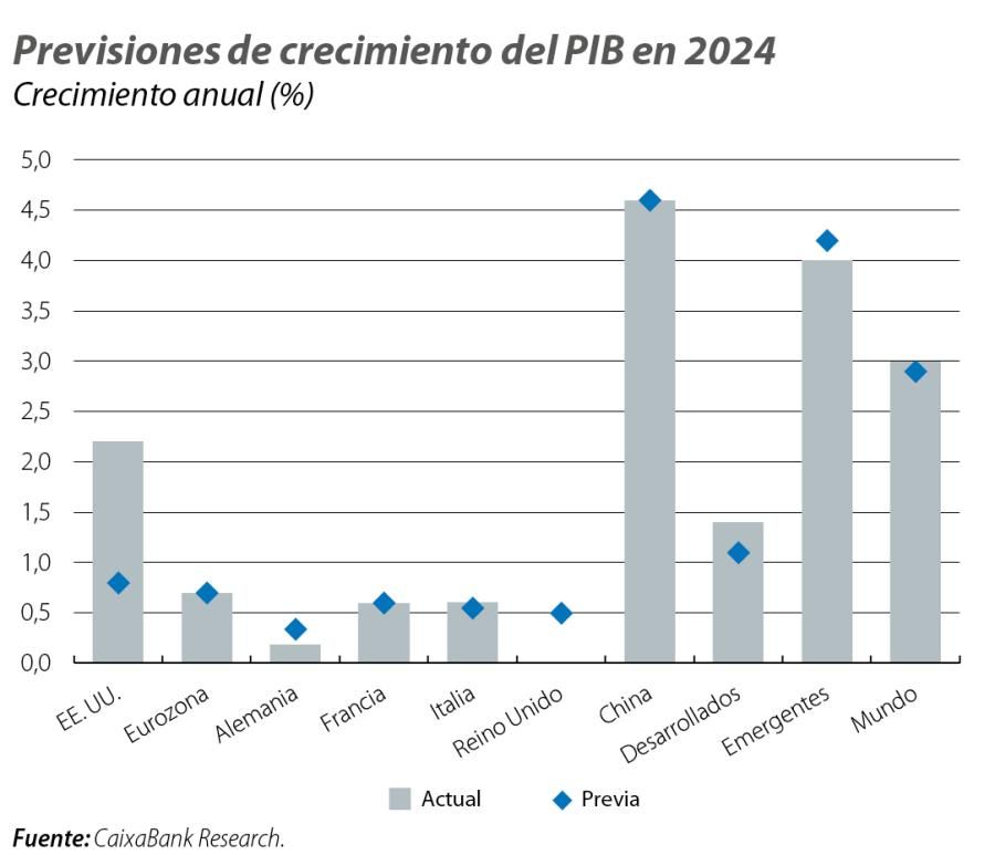 En los últimos trimestres, la economía mundial ha mostrado una notable resiliencia y estimamos que podría haber crecido en 2023 cerca de un 3,0%. Uno de los principales motores del crecimiento el pasado año fue EE. UU., que hizo gala de un notable dinamismo que le ha llevado a batir todas las expectativas. Lejos quedan los escenarios en los que se anticipaba que el tensionamiento monetario en un contexto de ausencia de estímulos fiscales arrastraría a la economía a la recesión, posibilidad que incluso llegó a plantear la Fed. La realidad es que el PIB de EE. UU. alcanzó un crecimiento intertrimestal medio del 0,8% (por encima de su media de largo plazo pre-COVID), con una segunda mitad de año excepcional, que situó el avance del PIB en el conjunto de 2023 en el 2,5%, frente al 0,5% que se preveía a comienzos del pasado año. Este dinamismo de la economía ha obligado a cambiar completamente el discurso y hay quienes incluso defienden un no landing de la economía americana. Nuestra postura es algo más conservadora y seguimos anticipando una desaceleración durante todo el año hasta ritmos intertrimestrales entre el 0,3%-0,4%, algo por debajo de su potencial. Con todo, el «efecto arrastre» de una segunda mitad de 2023 especialmente dinámica sumado a un inicio de año más expansivo de lo inicialmente estimado nos llevan a revisar el crecimiento para 2024 hasta el 2,2%, casi 1,4 p. p. por encima de la previsión inicial.