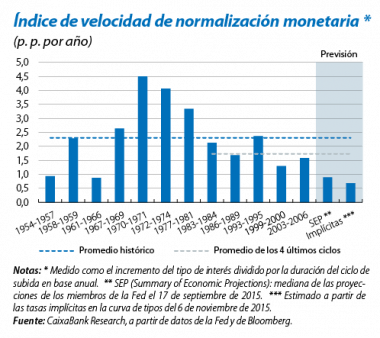 Desde mediados de los años cincuenta, EE. UU. ha experimentado 12 fases alcistas del tipo oficial de interés. Durante estos ciclos de subida, la trayectoria del tipo oficial se ha caracterizado por una duración con un promedio superior a los dos años y un incremento de casi 5 p. p. Si calculamos un «índice de velocidad» de normalización monetaria que resultase de dividir el incremento del tipo de interés por la duración del ciclo de subida, obtendríamos una velocidad media de 2,4 p. p. al año. Sin embargo, este promedio histórico proyecta una imagen sesgada al alza, puesto que incluye los años noventa y ochenta, de sustancial ajuste monetario, durante los cuales la Fed transformó la implementación de su política monetaria. Si nos centramos en los cuatro últimos ciclos, el tipo oficial experimentó, en promedio, una subida total ligeramente superior a 3 p. p. en menos de dos años, lo que da como resultado un índice de velocidad más cercano a 1,7 p. p. al año.