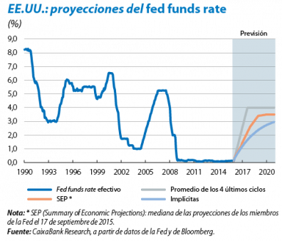 En definitiva, los factores que suelen guiar las decisiones de la Fed se encuentran esta vez en niveles que sugieren que una normalización más paulatina que en otras ocasiones es necesaria y apropiada. Así lo corrobora también el mercado, cuyas expectativas implícitas perfilan una senda algo más parsimoniosa que la que dibujan los miembros de la Fed.