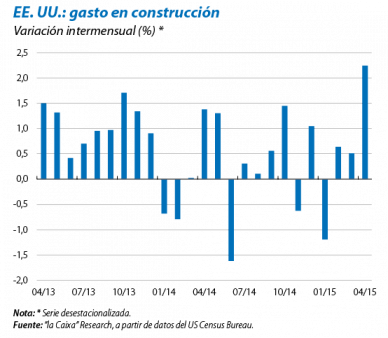 Los indicadores de actividad recientes apoyan la hipótesis de una mejora de la construcción en el 2T. Se confirma la recuperación del sector de la construcción después del descenso de la actividad de los primeros meses del año a causa del mal tiempo. Así, el generoso gasto en construcción de abril, especialmente en el sector industrial, supuso una reacción esperada tras la atonía del 1T. Asimismo, la cifra de viviendas iniciadas se situó en mayo un 15,1% por encima del registro de febrero, a pesar de descender respecto al mes de abril. Los índices de sentimiento empresarial (ISM) también continúan en la zona expansiva. El ISM de manufacturas, que en los últimos meses había sufrido el retroceso de la inversión en petróleo y en carbón, sumó en mayo su segundo avance consecutivo y se situó en los 52,8 puntos, cifra que se corresponde con crecimientos del PIB cercanos al 3%. El ISM de servicios tuvo un ligero retroceso en mayo, pero el nivel actual, de 55,7 puntos, coincide con crecimientos de la economía superiores al 3%.