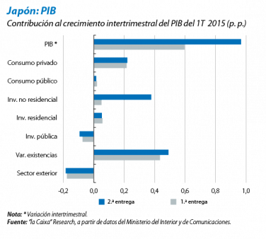 Revisión al alza del PIB del 1T 2015. La economía japonesa creció un 0,9% intertrimestral en el 1T 2015, claramente por encima del 0,6% previamente anunciado. La variación interanual marcó un retroceso del 1,0% (frente al –1,4% anterior). La práctica totalidad de la revisión, en términos absolutos, se debe a la mejora de la inversión en equipo, que pasó de crecer un 0,4% a un 2,7% intertrimestral. Pese a tratarse de un buen dato, el ciclo de existencias desfavorable, la volatilidad del componente inversor y, especialmente, la debilidad del consumo privado nos impiden que traslademos toda la subida que correspondería a nuestra previsión para 2015, que pasa del 0,8% al 1,0%.