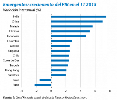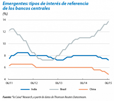 La India creció un 7,5% interanual en el 1T 2015. Aunque el dato es positivo, el avance del 4T 2014 se revisó sensiblemente a la baja (del 7,5% al 6,6%), lo que matiza el buen dato de principios de año. En este contexto, y ante la moderación de los precios, el banco central de la India redujo de nuevo el tipo de interés en 25 p. b., hasta el 7,25%. Un caso distinto es el de Brasil, cuyo banco central se vio obligado a subir el tipo de intervención a causa de la elevada inflación, todo ello en un entorno de crecimiento negativo.