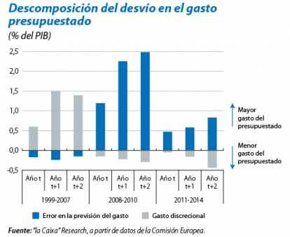 El desvío del gasto presupuestado se debe tanto a errores en las previsiones de los gastos como a gastos discrecionales incurridos durante la implementación de los presupuestos. La descomposición del desvío entre unos y otros muestra cómo, antes de 2008, la mayor parte del aumento del gasto no presupuestado respondía a medidas discrecionales. Sin embargo, a partir de 2008, el factor que explica los desajustes son unos gastos mayores de los previstos, en particular un incremento de los gastos sociales no presupuestados.