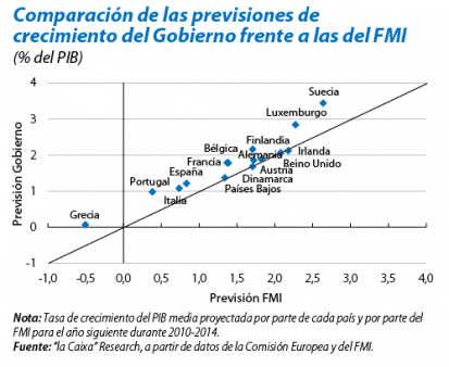 Este incremento no previsto del gasto no es completamente inocente: muchos países sobreestiman de forma recurrente su potencial de crecimiento al elaborar los presupuestos. Las previsiones de crecimiento para el año siguiente al de la presentación de los presupuestos públicos a la CE son de media un 0,3 p. p. mayores que las previsiones de crecimiento que proporcionan otros organismos, como el FMI, para el mismo periodo.