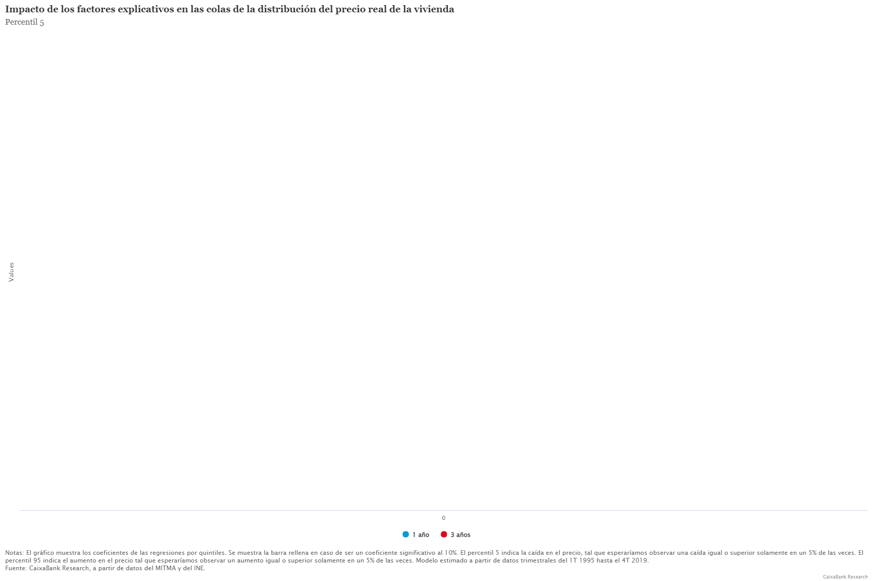 De acuerdo con lo esperado, un aumento en el crecimiento del PIB real está asociado con mayores crecimientos en los precios de la vivienda, mientras que una mayor dificultad de acceso a la vivienda (aumento en la ratio de accesibilidad) conlleva menores crecimientos. Un resultado interesante es que cuando hay un boom de crédito a los hogares para la compra de vivienda, el percentil 5 aumenta a 1 año vista, pero desciende a 3 años. Una posible explicación sería que un aumento del crédito afecta a los precios de la vivienda por dos canales. Por un lado, a corto plazo se mueve toda la distribución hacia la derecha: el mayor flujo de crédito impulsa la demanda de viviendas y favorece el crecimiento del precio. Por otro lado, un boom de crédito aumenta las posibilidades de gestación de una burbuja inmobiliaria (como en la crisis del 2008), lo que provoca que, a medio plazo, en caso de que estalle la burbuja (escenario adverso) la corrección en el precio sea mucho mayor.