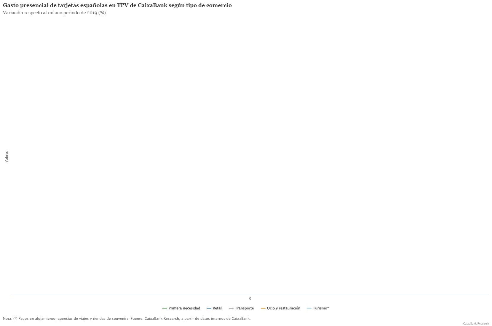 - El gasto en ocio y restauración registró el mismo crecimiento que en el 3T 2021 (29%), mientras que hubo un retroceso en los sectores de transporte y turismo (7 p. p. y 13 p. p. por debajo, respectivamente).
