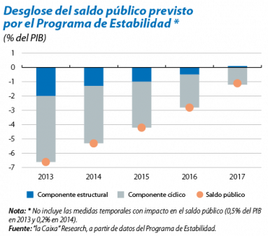Según los datos del nuevo programa, el ajuste del saldo cíclico seguirá liderando el proceso de consolidación fiscal en los próximos años, con un ritmo de contracción prácticamente constante de 9 décimas anuales entre 2015 y 2017. Aun así, la contribución del ajuste estructural, que caerá a un ritmo de 5 décimas al año, seguirá siendo notable. Con ello, se alcanzaría un superávit estructural del 0,1% en 2017 cumpliendo, con tres años de antelación, el objetivo de equilibrio del saldo estructural introducido por la Ley Orgánica de Estabilidad Presupuestaria.