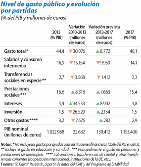 Esta reorientación del esfuerzo hará que el gasto público se reduzca significativamente con relación al PIB, del 44,4% en 2013 hasta el 40,1% en 2017. A diferencia de lo ocurrido en los últimos años, el principal aliado de esta disminución será, según el Programa de Estabilidad, la contención de las partidas de salarios públicos y consumos intermedios (cuyo peso en porcentaje del PIB se reducirá en 2,8 p. p.). Sin duda, la recientemente aprobada Reforma de las administraciones públicas jugará un papel importante en esta disminución. Otro factor a tener en cuenta es la caída del gasto en prestaciones sociales (de 1,2 p. p. del PIB) debido, sobre todo, al menor pago del subsidio de desempleo que se espera que genere la mejora del mercado laboral. En contraposición, el gasto en inversión, uno de los principales damnificados de las políticas de ajuste de los últimos años dejará de caer, manteniéndose en el 1,5% del PIB (aunque lejos del 4,0% del PIB en 2010).