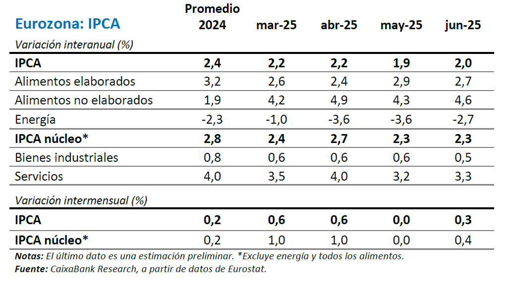 - La inflación general de la eurozona (IPCA) fue del 2,0% interanual en junio (+0,1 p. p. respecto a mayo), mientras que la núcleo se mantuvo en el 2,3%.