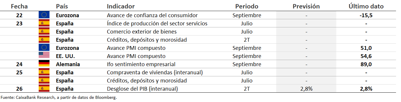 18-9-25 12-9-25 Var. semanal Acumulado 2025 Var. interanual Tipos (puntos básicos) Tipos 3 meses Eurozona (Euribor) 2,03 2,00 3 -69 -143 EE. UU. (SOFR) 4,02 4,02 +0 -29 -73 Tipos 12 meses Eurozona (Euribor) 2,16 2,17 -1 -30 -78 EE. UU. (SOFR) 3,60 3,58 +2 -58 -25 Tipos 2 años Alemania 2,01 2,02 -1 -7 -21 EE. UU. 3,56 3,56 +0 -68 -2 Tipos 10 años Alemania 2,73 2,72 2 36 53 EE. UU. 4,10 4,06 4 -47 39 España 3,29 3,29 0 23 29 Portugal 3,13 3,13 0 28 36 Prima de riesgo (10 años) España 56 57 -2 -14 -24 Portugal 40 41 -2 -8 -18 Renta variable (porcentaje) S&P 500 6.632 6.584 0,7% 12,8% 16,1% Euro Stoxx 50 5.457 5.391 1,2% 11,5% 10,4% IBEX 35 15.175 15.308 -0,9% 31,5% 28,8% PSI 20 7.726 7.748 -0,3% 21,2% 15,0% MSCI emergentes 1.346 1.326 1,5% 25,1% 22,3% Divisas (porcentaje) EUR/USD dólares por euro 1,179 1,173 0,5% 13,8% 5,6% EUR/GBP libras por euro 0,870 0,865 0,5% 5,1% 3,5% USD/CNY yuanes por dólar 7,112 7,125 -0,2% -2,6% 0,7% USD/MXN pesos por dólar 18,360 18,439 -0,4% -11,8% -5,0% Materias Primas (porcentaje) Índice global 103,4 103,8 -0,4% 4,7% 5,6% Brent a un mes $/barril 67,4 67,0 0,7% -9,6% -9,9% Gas n. a un mes €/MWh 33,0 32,7 0,9% -32,6% -0,4% Fuente: CaixaBank Research, a partir de datos de Bloomberg.