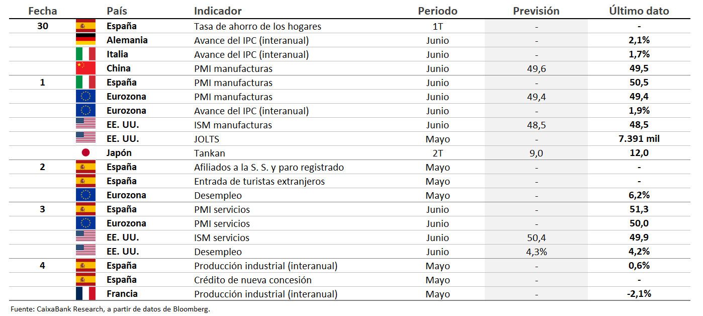 El Parlamento alemán aprobó un proyecto de presupuestos para 2025 –que debería estar listo para septiembre– y un marco presupuestario para 2026, donde se recoge un incremento del gasto federal de más de un 6,0% en 2025 y superior al 3,0% en 2026, por el incremento del gasto en defensa y en inversión. Presentan un aumento progresivo del gasto en defensa, desde el 2,1% del PIB de 2024 hasta el 2,4% en 2025, y llegaría a cerca del 3,5% del PIB en 2029 (muy en línea con lo que ya teníamos recogido en nuestros escenarios). Respecto a las inversiones en infraestructuras, presentan unos objetivos bastante ambiciosos, sobre todo a corto plazo, con un incremento de casi un 0,9% en términos de PIB en 2025 (parece difícil de alcanzar dadas las fechas en las que nos encontramos) y del 1,2% en 2026. Estos presupuestos introducen riesgos al alza, aunque modestos, para nuestras previsiones de crecimiento del 0,4% en 2025 y del 1,0% en 2026. Este mejor sentimiento hacia la economía alemana se ve reflejado también en el comportamiento de los principales indicadores de clima empresarial. Así, el Ifo de junio subió 0,9 puntos, hasta 88,4, máximo del último año (100 es el umbral compatible con crecimientos cercanos a su media de largo plazo), al tiempo que el PMI compuesto logró subir 1,9 puntos, hasta 50,4 (por encima de 50, indica crecimientos positivos). El relativo optimismo alemán contrasta con Francia, en donde el PMI compuesto cayó 0,8 puntos hasta 48,5 (por el deterioro de las manufacturas), manteniéndose en zona de caída de la actividad casi dos años de forma consecutiva, y condicionando que el PMI para la eurozona se mantuviera en el 50,2.