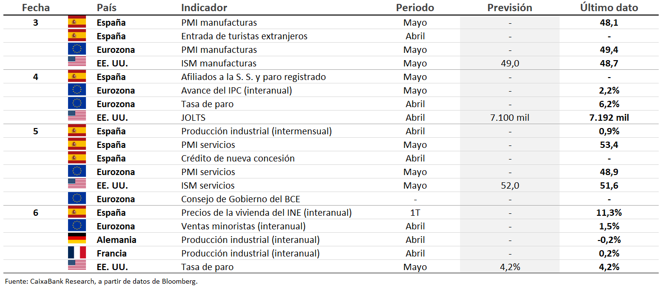 Los mercados financieros globales cerraron la semana con un tono mixto, en un contexto de elevada incertidumbre comercial, después de que gran parte de las subidas arancelarias de Trump entrasen en una batalla judicial, y señales más bien negativas sobre el crecimiento económico en EE. UU. Aquí, la revisión del PIB del 1T fue mínima (y al alza), y hubo alguna sorpresa positiva, como el repunte en la confianza del consumidor en mayo; pero el consumo privado se corrigió levemente a la baja, lo que, unido al repunte en las solicitudes de desempleo en la pasada semana o la caída en los beneficios empresariales en el 1T, presionaron a la baja las rentabilidades soberanas, especialmente en los tramos largos. En la eurozona, la rentabilidad de la deuda soberana también descendió, aunque con menos intensidad. Destacó la reducción de la prima italiana, apoyada por la revisión al alza de su perspectiva crediticia por parte de Moody’s, que se suma a las ya positivas de Fitch y DBRS. En cuanto al BCE, el mercado descuenta como segura una nueva bajada de tipos en su reunión de la próxima semana, aunque para julio la expectativa continúa siendo de pausa. En el mercado de divisas, el dólar se mantuvo plano frente al euro, si bien se apreció frente al yen, con el mercado de deuda soberana japonesa que mostró cierta estabilización tras semanas de importantes repuntes en los tramos a más largo plazo. En renta variable, los índices estadounidenses avanzaron, impulsados por los sólidos resultados de Nvidia, mientras que en Europa hubo más divergencia: el IBEX se mantuvo prácticamente plano, mientras que el DAX alemán fue, junto con el índice italiano, el que más avanzó, beneficiado por la revisión al alza del PIB del 1T, así como por unos datos de consumo e inversión en el 1T mejores a lo esperado. En Asia, el CSI 300 chino retrocedió levemente, lastrado por cierta debilidad del sector tecnológico. Por último, en el mercado de materias primas, el petróleo y el gas natural europeos registraron caídas, ante la expectativa de mayor oferta y menor demanda global.