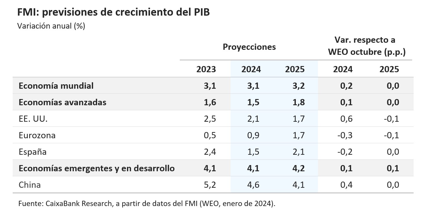 El FMI, en su actualización de previsiones de enero, revisa 0,2 p. p. al alza el crecimiento mundial estimado para 2024, hasta el 3,1%, gracias a las mejores perspectivas que maneja para EE. UU. y China. Sin embargo, el crecimiento medio mundial para 2024-2025 se situaría por debajo de su media de largo plazo prepandemia, del 3,8%, debido al impacto que todavía tendrán las subidas de tipos llevadas a cabo por los principales bancos centrales y a la retirada de los estímulos fiscales en un contexto de elevado endeudamiento y baja productividad. Por otro lado, el FMI señala que la inflación está descendiendo más rápido de lo previsto en buena parte del mundo, gracias a las políticas monetarias restrictivas adoptadas y a la normalización de las cadenas de oferta globales. De hecho, estima que la inflación general mundial descienda al 5,8% en 2024 y al 4,4% en 2025, tras el 6,8% de 2023. El FMI señala que los riesgos se encuentran bastante equilibrados, aunque, entre otros, reconoce que los conflictos geopolíticos en curso pueden provocar problemas o interrupciones del suministro de algunas materias primas y que hay que seguir pendientes de los problemas del sector inmobiliario en China.