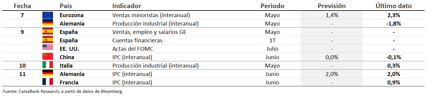 Los mercados financieros han mostrado un tono positivo, apoyados por el optimismo en torno a las negociaciones comerciales, aunque con la atención puesta en el 9 de julio, fecha en la que expira la pausa de los aranceles recíprocos. También contribuyó la expectativa de una política monetaria algo más acomodaticia en EE. UU., si bien los mercados ajustaron sus previsiones tras la sorpresa positiva en la creación de empleo de junio (el mercado prácticamente descarta un recorte en julio y la probabilidad de una tercera bajada en 2025 se redujo hasta el 10%, desde el 60% previo a la publicación del dato). En este contexto, se registraron subidas generalizadas en los índices bursátiles a ambos lados del Atlántico; la renta variable estadounidense cerró la semana (el viernes las bolsas permanecen cerradas por festivo) alcanzando nuevos máximos (el S&P 500 se revalorizó un 2,3%). En Sintra, Powell reconoció que la Fed ya habría iniciado bajadas de tipos de no ser por los aranceles de la Administración Trump, mientras que Lagarde afirmó que la inflación en la eurozona ya se sitúa en el objetivo. En este contexto, el euro se apreció hasta alcanzar casi los 1,18 dólares (+0,5% en la semana), su nivel más alto desde 2021, aunque el billete verde recuperó algo de terreno tras la publicación del sólido informe de empleo en EE. UU. En los mercados de renta fija, los rendimientos soberanos repuntaron hacia el final de la semana en EE. UU. (especialmente en los tramos cortos), tras el anuncio de un acuerdo comercial entre EE. UU. y Vietnam, y la aprobación en el Congreso del paquete fiscal de la Administración Trump. En contraste, en la eurozona las rentabilidades cayeron en la parte final de la semana, tras el impacto provocado por la incertidumbre fiscal en el Reino Unido. Allí, la tensión política provocó un fuerte repunte de las rentabilidades de los gilts (el 10 años repuntó 15 p. b. el miércoles hasta el 4,6%), que se moderó parcialmente al cierre de la semana tras el respaldo del primer ministro Starmer a la continuidad de Rachel Reeves como ministra de Finanzas. En materias primas, el petróleo aumentó en el balance de las últimas cinco sesiones, pero perdió fuelle al cierre de la semana, en un contexto de incertidumbre sobre la demanda global, un esperado aumento de la oferta (este domingo se reúne la OPEP+) y tras la suspensión de la cooperación de Irán con el organismo nuclear de la ONU.
