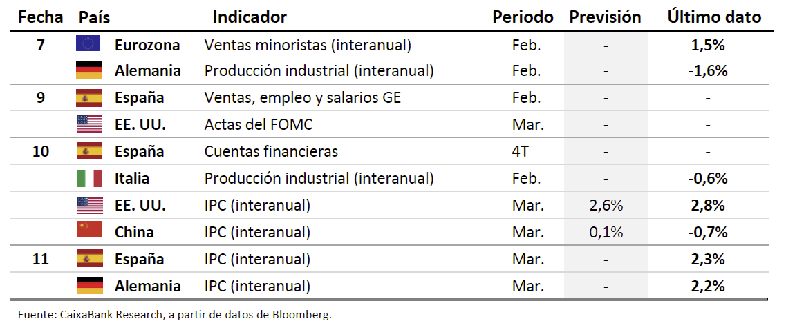 La fuerte y generalizada subida de aranceles de EE. UU. materializó uno de los peores escenarios que barajaban los inversores y ha profundizado la aversión al riesgo que ya venía dominando al mercado desde hacía varias semanas. El movimiento en los distintos activos reflejó una creciente preocupación por la sostenibilidad del crecimiento económico en EE. UU. mientras las medidas de inflación esperadas en EE. UU. repuntaron en los plazos más cortos. Así, los implícitos del mercado monetario pasaron a descontar como más probable cuatro bajadas de tipos de la Fed en 2025 y una más en 2026, hasta llevar el fed funds al intervalo del 3%-3,25%. En el caso del BCE, la fuerte subida de aranceles supuso una caída en las expectativas de inflación a corto plazo, probablemente descontando un mayor comercio con las economías asiáticas y la importación de algo de deflación. En este contexto, se cimentó la expectativa de que el BCE alcance el 1,75% como nivel de llegada este 2025. Por otro lado, la rentabilidad de la deuda soberana cayó unos 20 p. b. a lo largo de toda la curva estadounidense, aunque sin gran variación en la pendiente. Las caídas del acumulado de la semana en la eurozona son de menor entidad y los diferenciales periféricos se mantuvieron prácticamente planos. En cuanto a las divisas, depreciación generalizada e intensa del dólar frente a sus principales pares, en un movimiento que refleja tanto cierta salida de los activos estadounidenses como los menores tipos reales esperados en EE. UU. a corto plazo (los mencionados menores tipos de la Fed y una mayor inflación). Además de la apreciación del euro (2%), que se sitúa ya por encima de los 1,10 dólares, destacaron igualmente las apreciaciones del yen y el franco suizo, que actuaron como activos refugio, así como las del peso mexicano (2,1%) y el dólar canadiense (1,5%), después de que sus economías estuvieran exentas de aranceles adicionales. En el mercado de renta variable, las correcciones fueron generalizadas en los mercados desarrollados, con caídas similares en Europa y EE. UU., de en torno al –4%. Los mercados emergentes tuvieron un mejor comportamiento, con caídas algo más limitadas en los índices chinos y, en particular, en los latinoamericanos, de modo que el índice MSCI All Country World cayó un 2,7%. Por último, en el mercado de materias primas, el barril de petróleo Brent de referencia en Europa bajó casi un 5%, una caída similar a la de los metales industriales, por las dudas respecto al crecimiento y la demanda internacional.